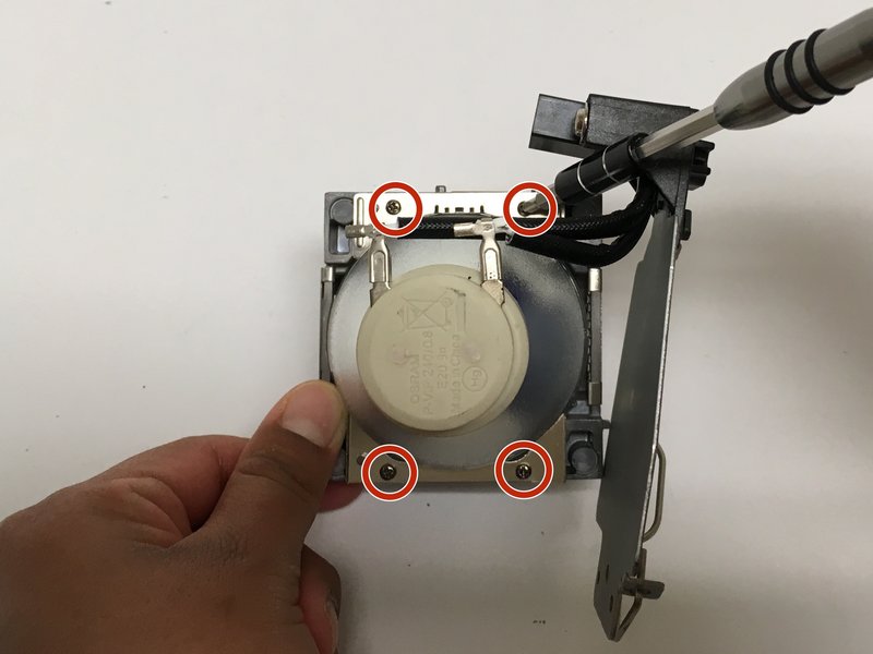 با استفاده از یک پیچ گوشتی فیلیپس شماره 1 (PH1) ، پیچ 2.5 میلی متری فیلیپس شماره 1 را که محفظه لامپ را به پروژکتور محکم می کند ، شل کرده و آن را بردارید.